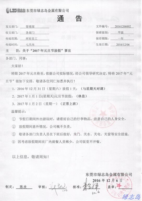 2017元旦放假通知-綠誌島-領先綠色科技