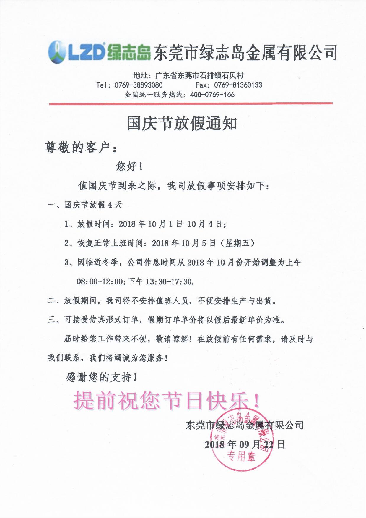 綠誌島2018年國慶放假通知